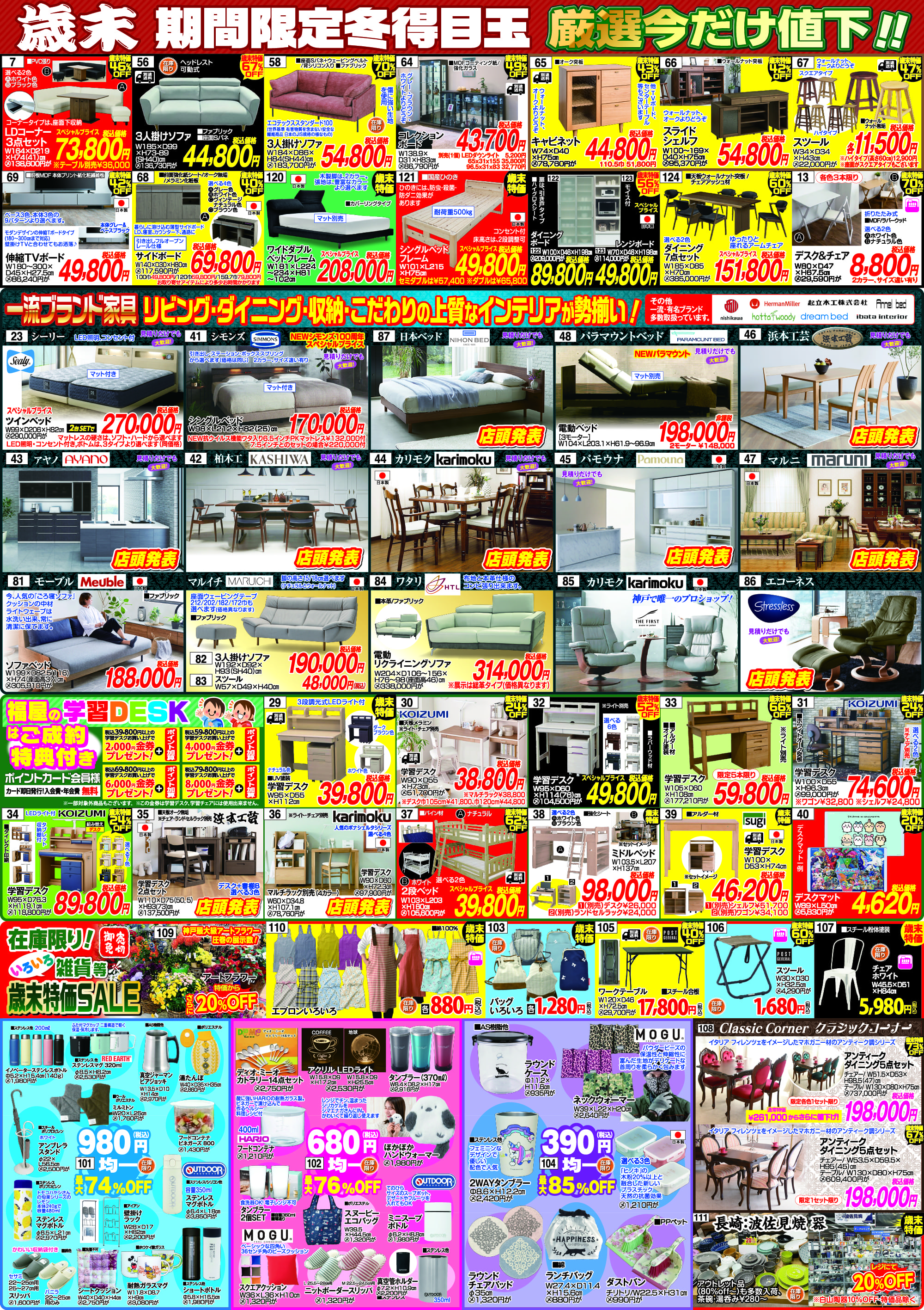 シモンズ・日本ベッドなどの一流ブランド家具を取り揃えております。