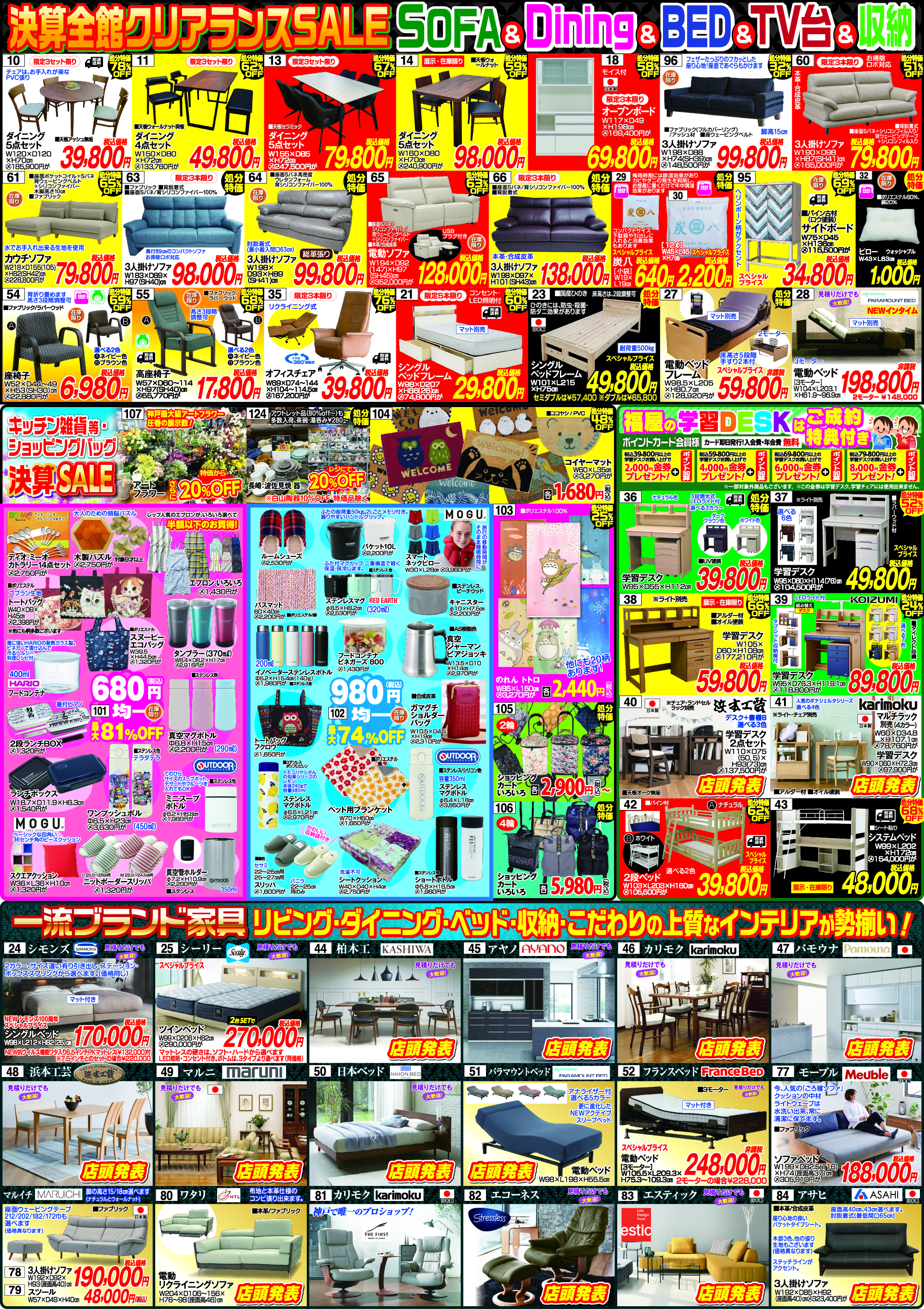 パモウナ・綾野製作所・カリモク家具・浜本工芸・マルニ・柏木工・ナガノインテリア・マルイチセーリング・日本ベッド・フランスベッド・シーリー・シモンズ・パラマウントベッドなど国内外の有名ブランドから、おしゃれなインテリア雑貨まで売場面積2000坪関西最大級の広々フロアで、家具全般はもちろん、カーテン・カーペットも充実の品揃え!!